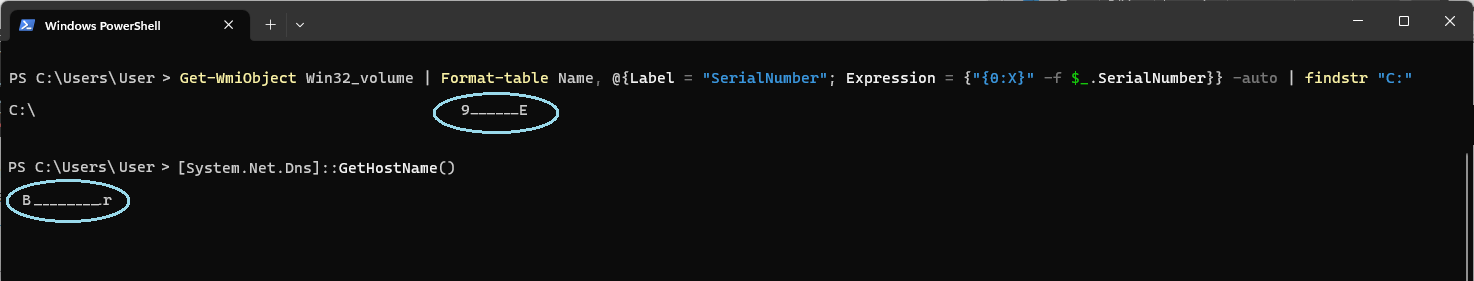 Get-WmiObject Win32_volume | Format-table Name, @{Label = "SerialNumber"; Expression = {"{0:X}" -f $_.SerialNumber}} -auto | findstr "C:"