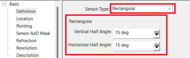 Right-click again and select Properties. In the Basic - Definition page, select Rectangular in the "Sensor Type:" dropdown menu. Set both half-angle values to 15 degrees: