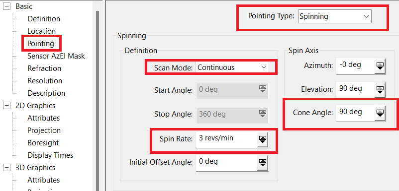 Now go to Basic - Pointing and in the "Pointing Type:" dropdown menu, select Spinning. This will define a spinning sensor's sweep. Set the following properties, and click Apply: