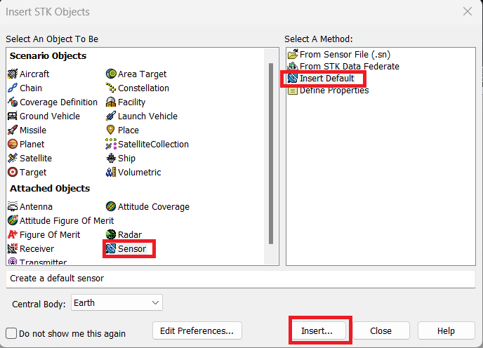 In the "Insert STK Object" tool, select Sensor, and for the "Select A Method:" parameter, click Insert Default.