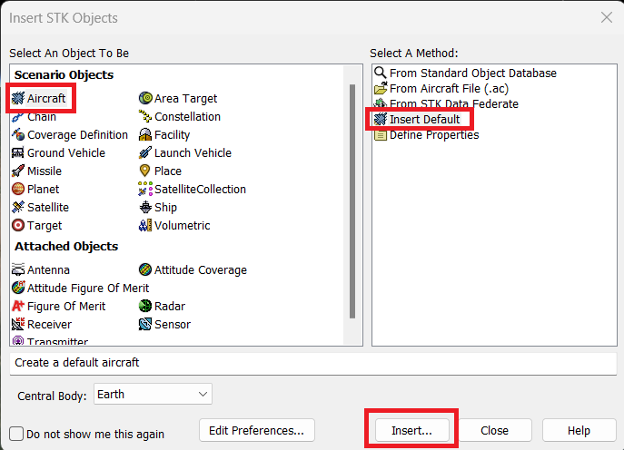 Let's repeat the first steps we went through. Select Insert on the toolbar at the top of your screen and select New to reopen the "Insert STK Objects:" page. Select the Aircraft object, then Insert Default as the method: