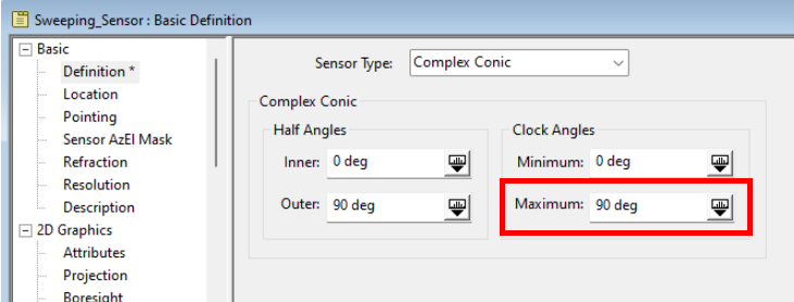 In the Basic - Definition page of Sweeping_Sensor's properties, select Complex Conic for the "Sensor Type:" Then, set the following half angle and clock angle values:
