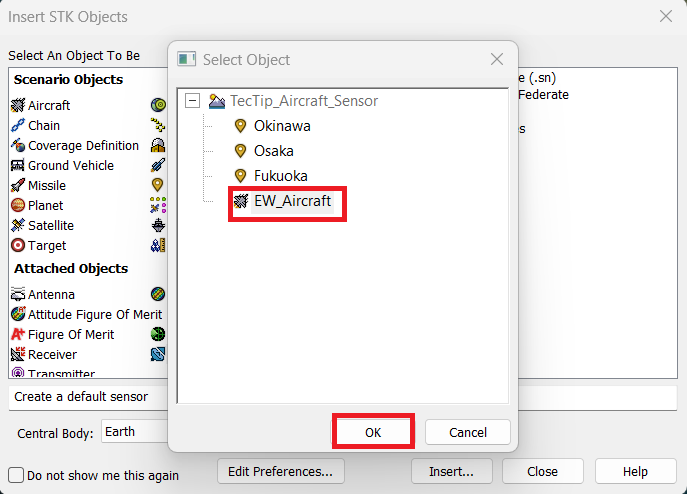 Select Insert, and you will be prompted to select a parent object for your sensor. Select Okinawa as the parent object, click Ok, and close the "Insert STK Object" tool.