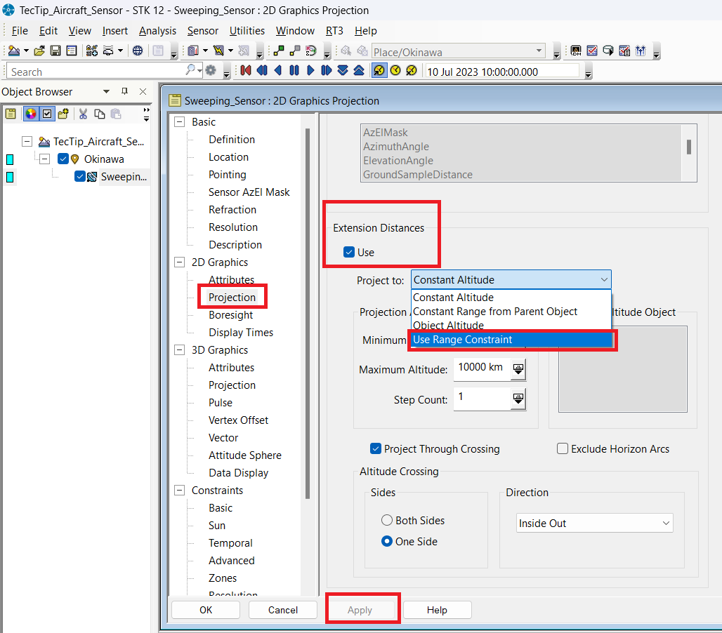 Lastly, you want your 2D and 3D projections (visualizations) to match your constraints. In order to do that, go to the 2D Graphics - Projection Tab and look at your "Extension Distance" settings. Set the Use option to checked and select Use Range Constraint in the "Project To:" dropdown menu. Click Apply: