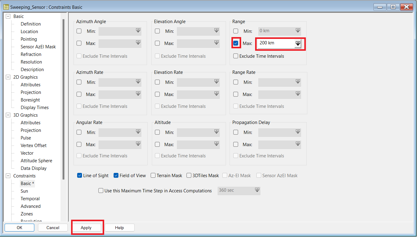 Now that you defined your Sensor's field of view and spinning parameters, you will probably want to constrain it to a certain range. In order to do that, go to Constraints - Basic, input the following values, and click Apply: