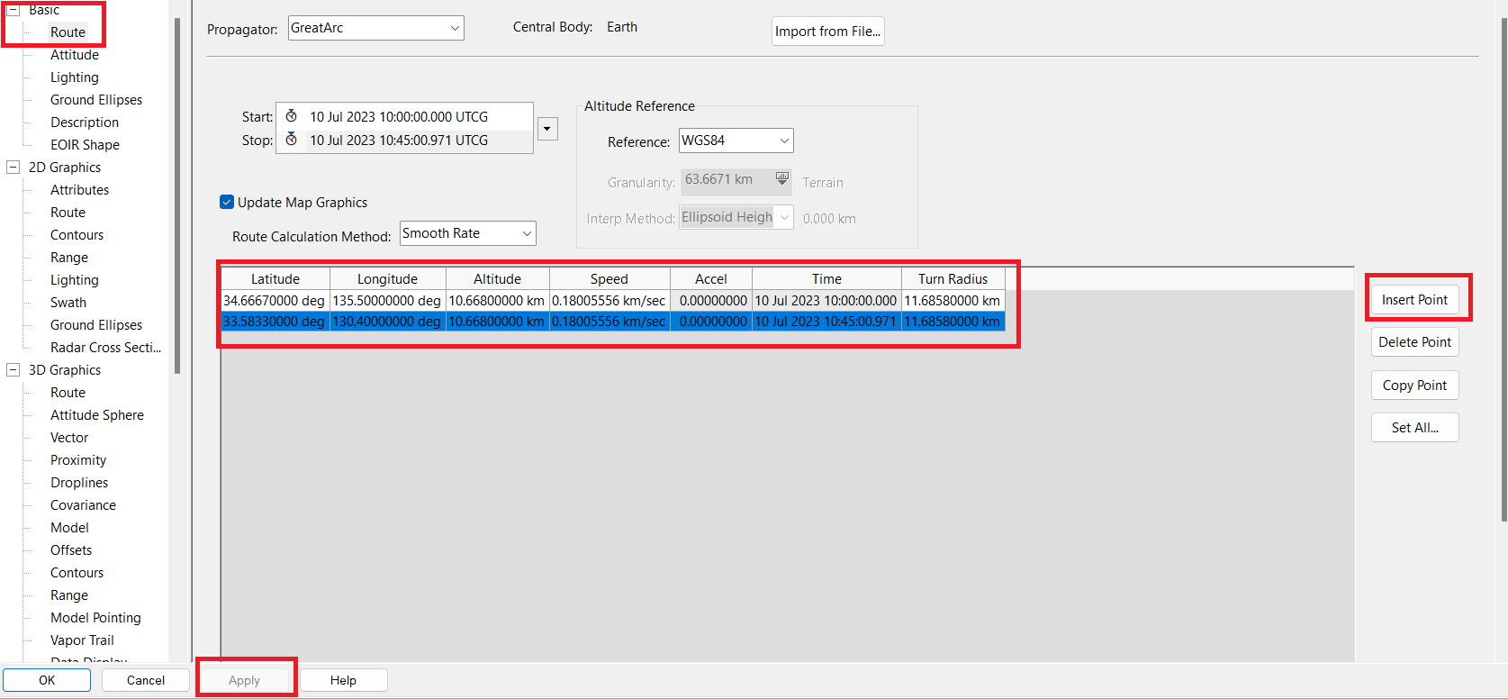 Right-click again on your EW_Aircraft and click on Properties. You will now create a new trajectory from Osaka to Fukuoka. Stay in the Basic - Route tab. Make sure that the "Propagator:" selected is GreatArc, and click Insert Point twice to add two checkpoints.