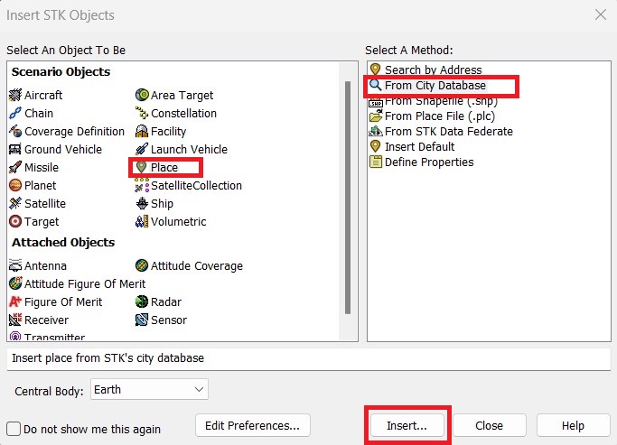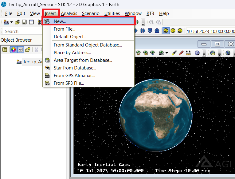 We will select from the top bar Insert, then New... to open the Insert STK Object dialog: