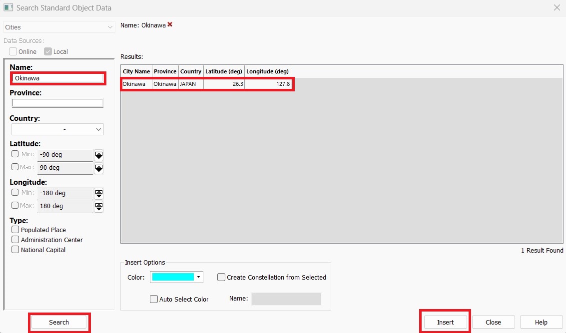 When the Standard Object Database dialog opens, type "Okinawa" in the "Name:" tab. Then click Search. You should see one result. Click this result and click Insert to add the object to the scenario. Close the dialog by clicking Close, but do not close the "Insert STK Object" tool.