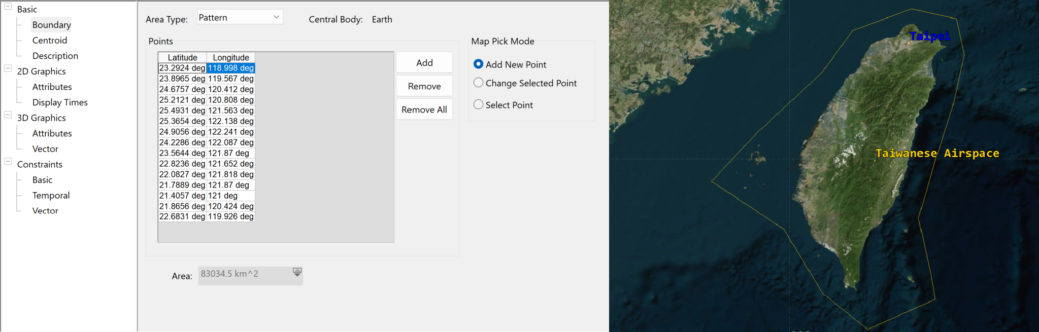 The Area Target object models a region on the surface of the central body. You can use the Boundary constraint to add several geographic points defined by their latitude and longitude after selecting the Area Type called "Pattern". You can simply add points by clicking on the 2D map after having opened the Area Target's Boundary properties and you can see the results below: