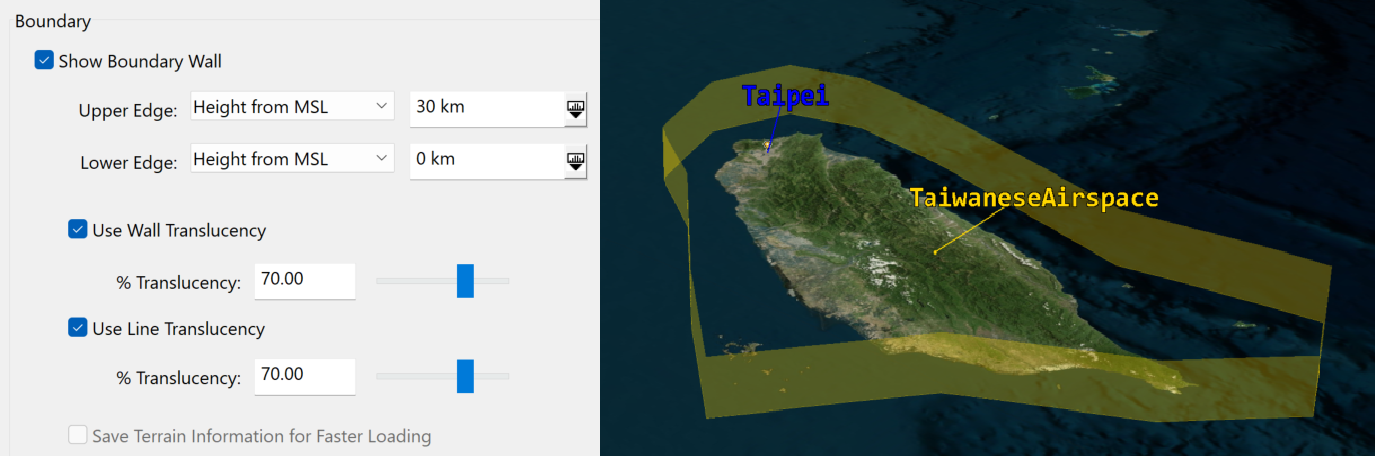 For 3D visualization purposes it is interesting and visually pleasant adjust settings in your 3D Attributes Page - Attributes. You can check the Show Boundary Wall option and for example set up a 30km Upper Edge and 0km Lower Edge using Height from MSL as reference since our airspace boundaries positions are set on the sea. You can also adjust Wall Translucency and Line Translucency as you wish: