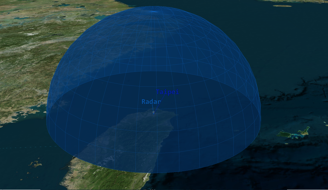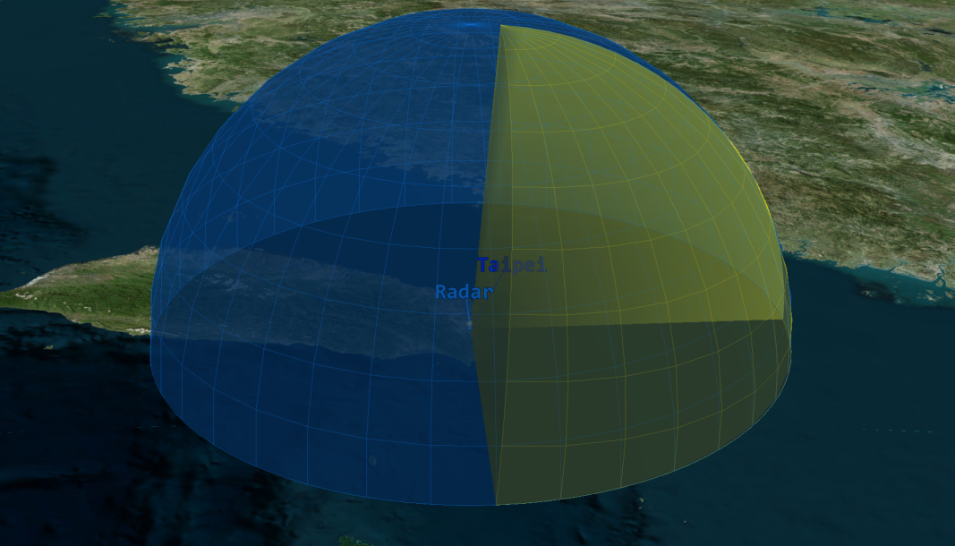 Depending on the types of radar systems you would like to use, you may have different types of sensors to set up in STK. Here we will use a simple dome radar in Taipei, and we will see it spinning within the volume that it can cover.