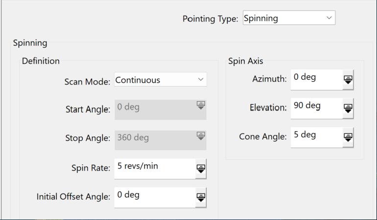 - your Scan Mode which allows you to specify whether your sensor should scan from one specific angle to another, be bidirectional or continuous and spin 360 degrees just like in our scenario.