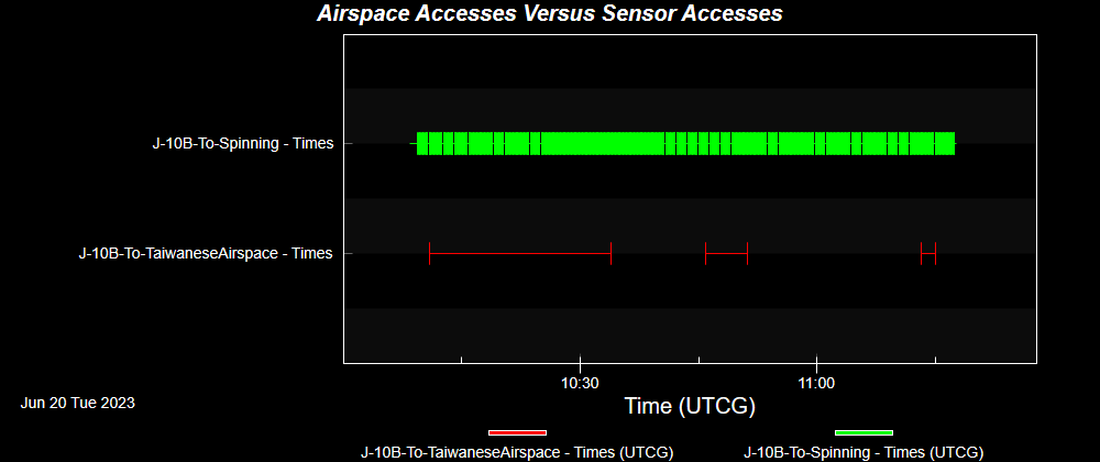 As you can see, our Sensor covers most of the aircraft flight path even when it exits the airspace thanks to its large range and it covers it several times over the length of the scenario because as it is spinning, it loses contact with the aircraft, whereas the Area Target object maintains access during all of the duration of the airspace violation.