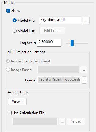 - In the model page, make sure that the Show box is checked, and in the Model File, click the ellipsis button and navigate to the folder you previously downloaded extracted in your scenario which contains your 3D model. There, select the .mdl file called "sky_dome.mdl" if you used the day time sky dome.