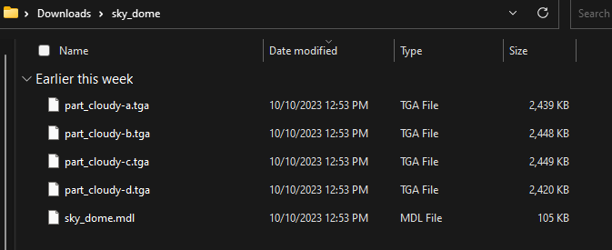 Now, you should be also able to edit your own sky domes by replacing the 4 cloud .tga files by other tga files from 360 panoramic pictures. These .tga files are to be set in the same folder as the .mdl file which reads them and is basically code. These files for the sky dome that we downloaded are organized like this: