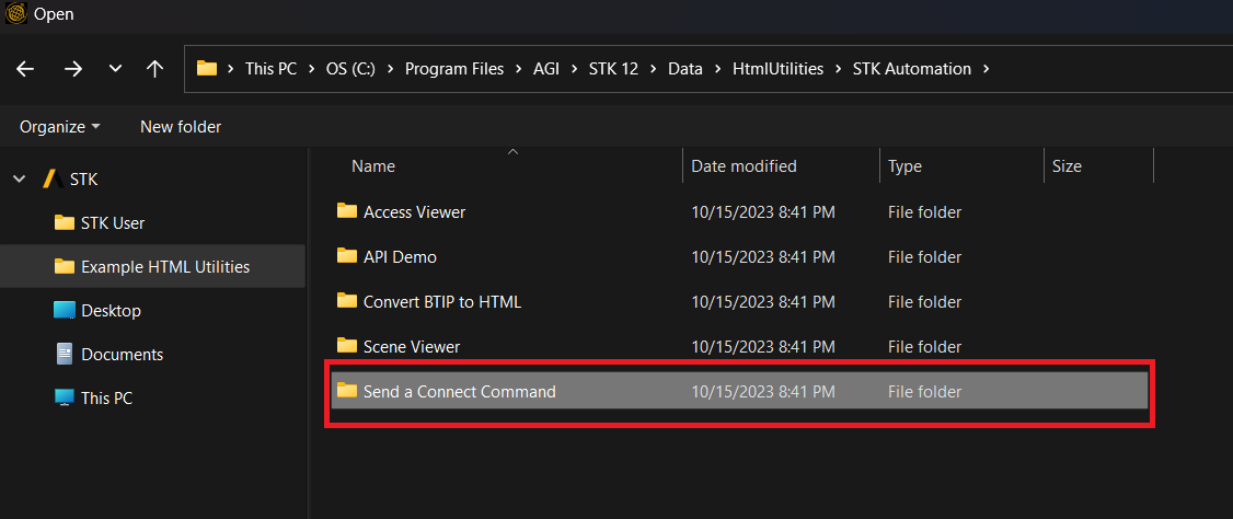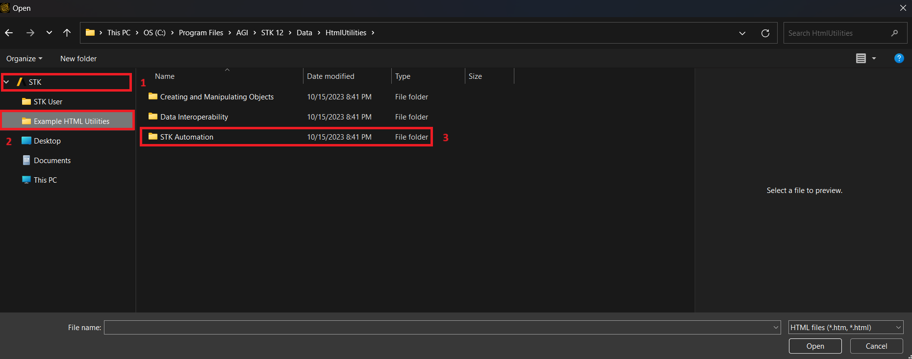 Once you click on the Folder Icon, your File Explorer will be opened to select which file you want to open with the Web Browser. Make sure you are in the STK Branch (1), then click on the Example HTML Utilities folder (2) and double-click on the STK Automation folder (3):