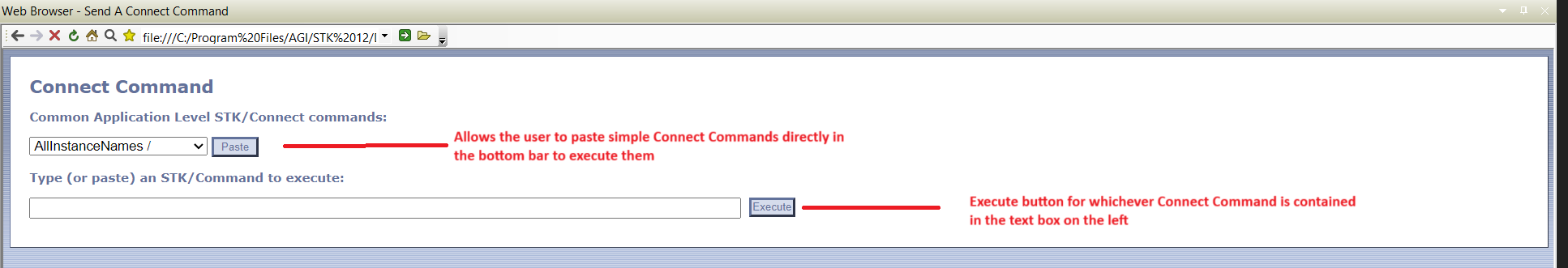 STK has an embedded tool present natively called the Web Browser. It can help you to in turn open a natively present GUI that interacts with your current STK scenario and send and test Connect Commands through it.