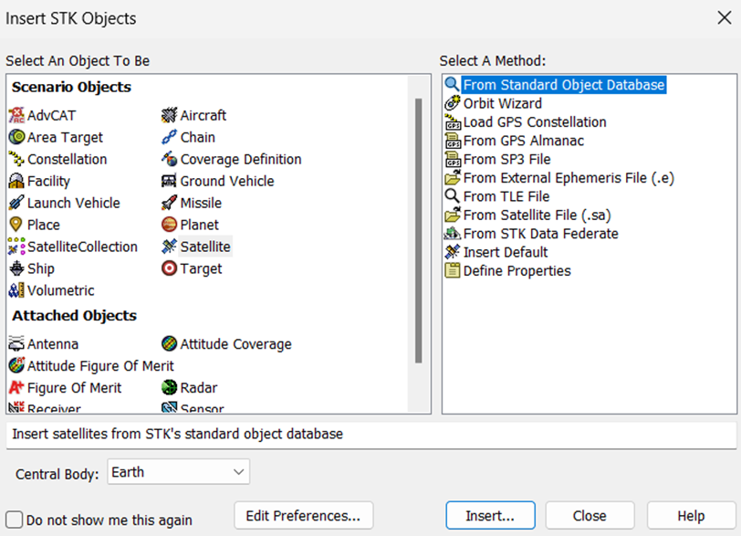 Select Satellite as the Scenario Object, and From Standard Object Database as the method before clicking the Insert… button