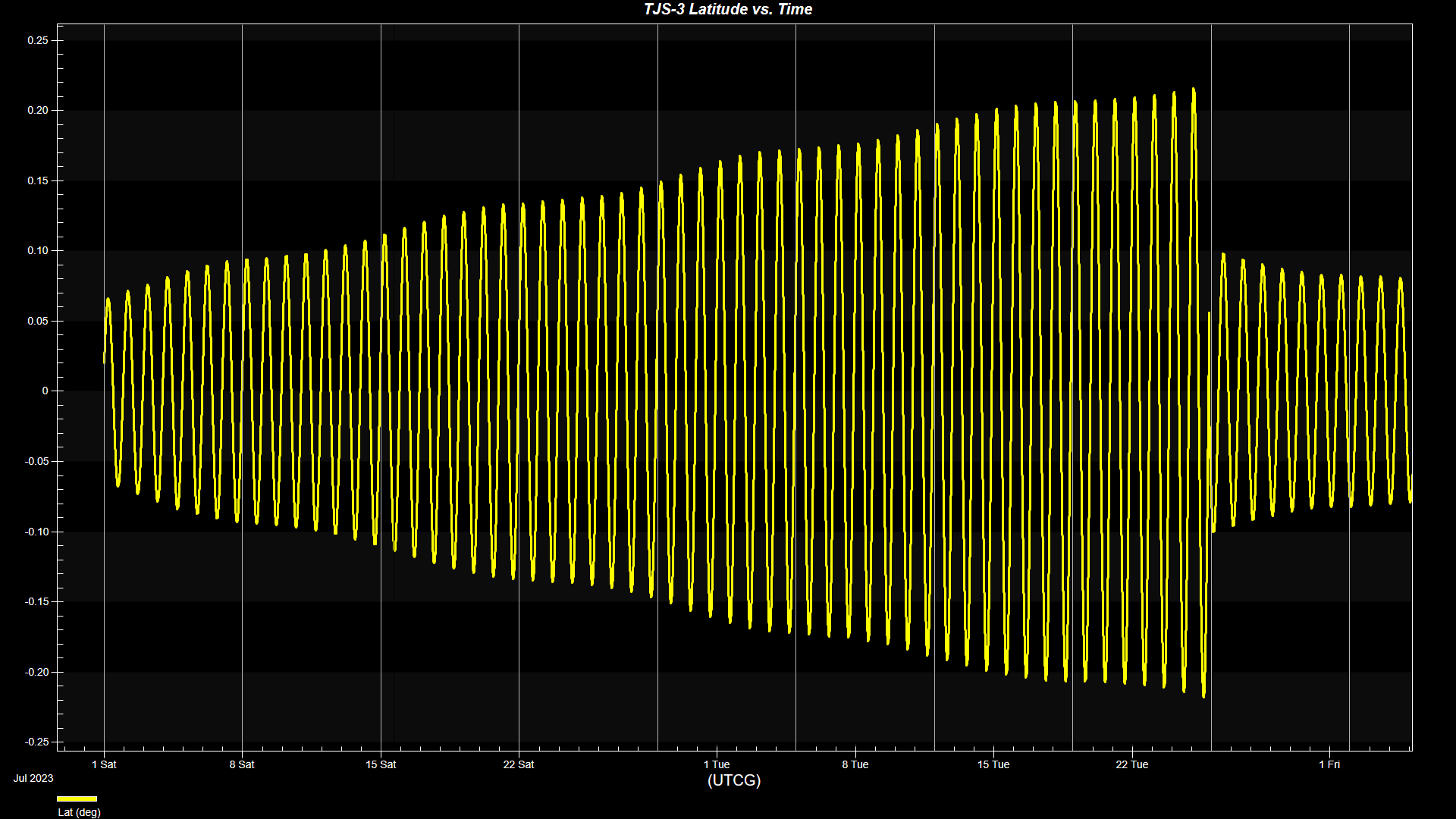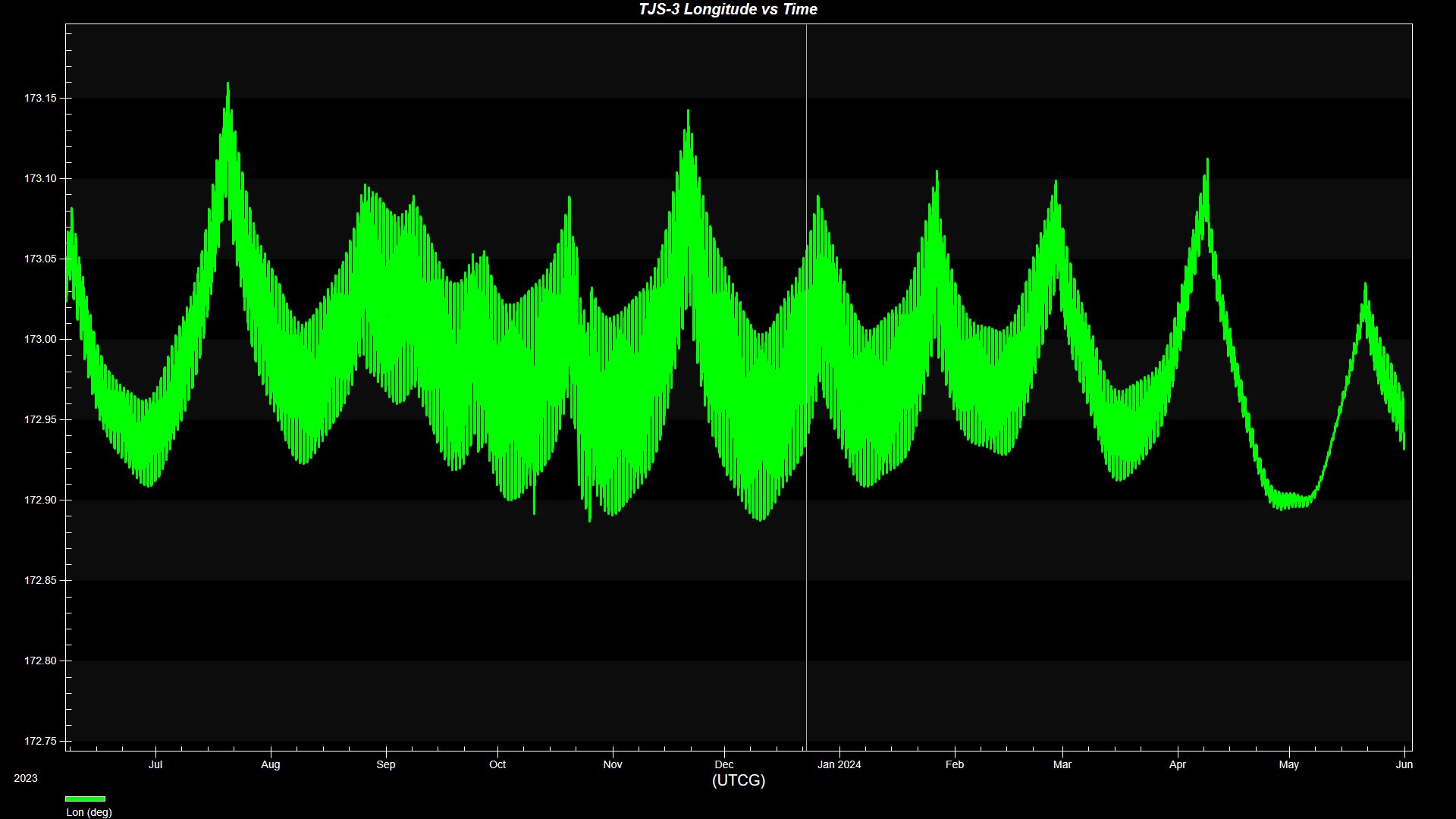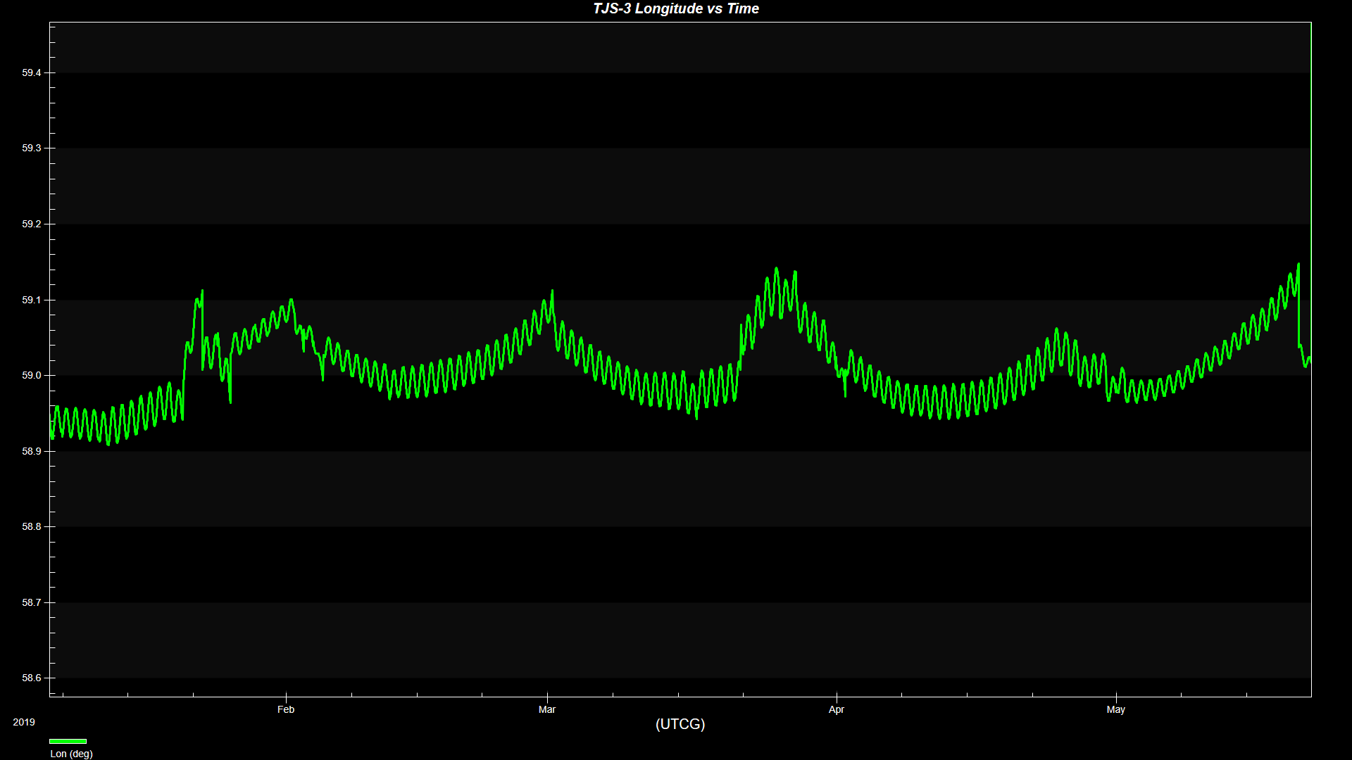 We can see than since the start of its nominal operations, TJS-3's longitude has been ranging from 59 to 173 degrees, staying in stable plateau patterns thanks to station keeping at its longitudes of interest.