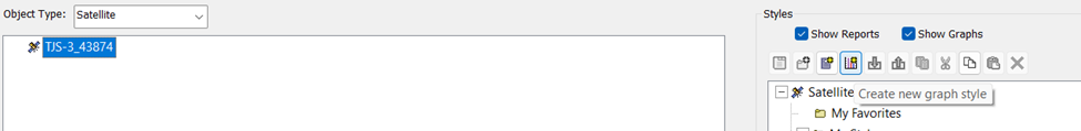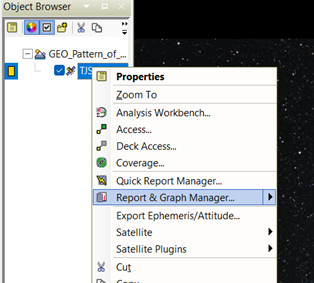 In the Object Browser, right-click on our TJS-3 satellite object, and click on the Report & Graph Manager button