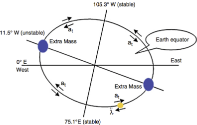 This figure displays the movement of a satellite in GEO. If a satellite is located at 0º longitude, it will drift to the nearest stable point, which is the 75.1º E longitude. Source: [6] H. Li, Geostationary Satellites Collocation. New York: Springer; Beijing, China: National Defense Industry Press, 2014, pp. 124.