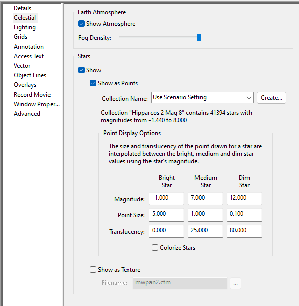 To add the celestial Background, Select the “Show as Texture” checkbox. For locating the file, click the ellipsis next to the filename box and navigate to the STK install location and open the “AGI Celestial Imagery” folder and from there, select the mwpan2.ctm file.