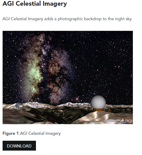 To download the celestial imagery model, go to the AGI Support website (www.agi.com/support) and from the Resources Menu, select the Data Disc option.
