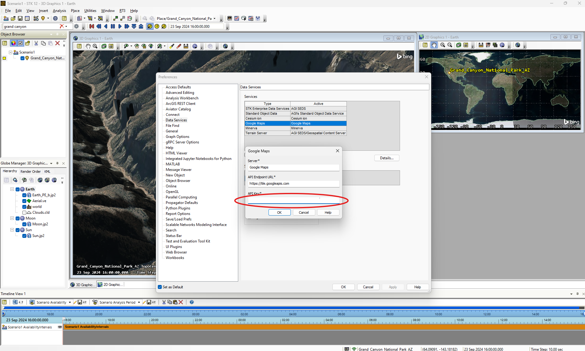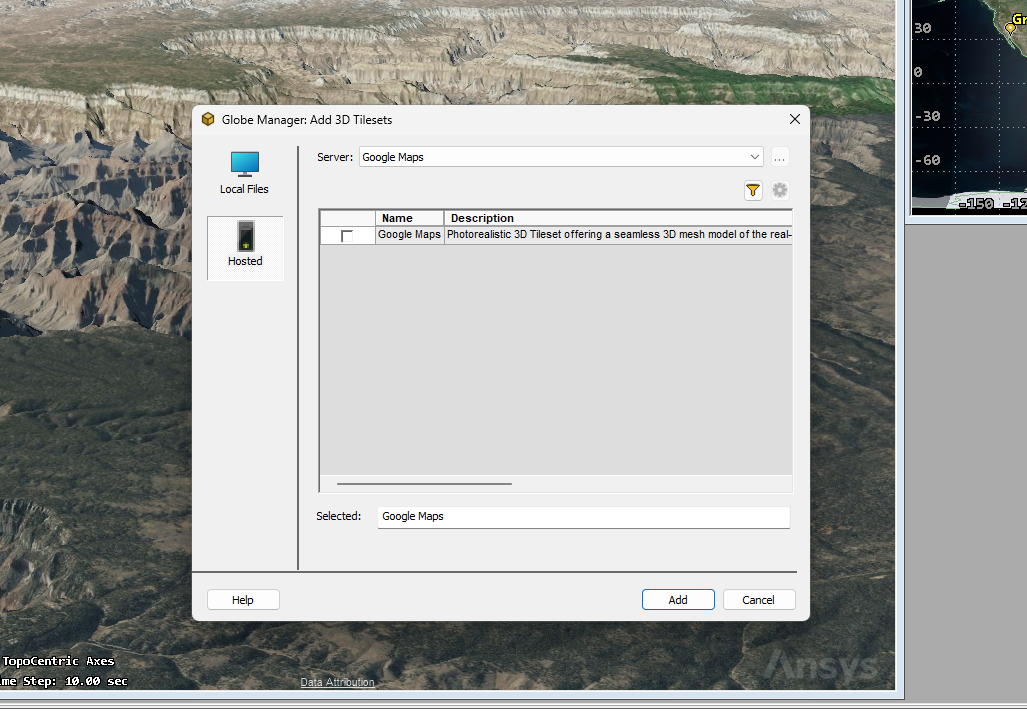 NOTE: This streaming data is limited to visualization ONLY at this point. Google’s terms of service restrict anyone from using their data for analytical purposes, which means STK cannot leverage this data for querying altitudes, sensor obscurations, or anything else other than just the visualization of the data. Hopefully this is something that will be relaxed in the future or perhaps available through data partnership options, but for now this data is simply a richer visual enhancement for STK scenarios. Its value for situational awareness and decision support is one that shouldn’t be undervalued of course.